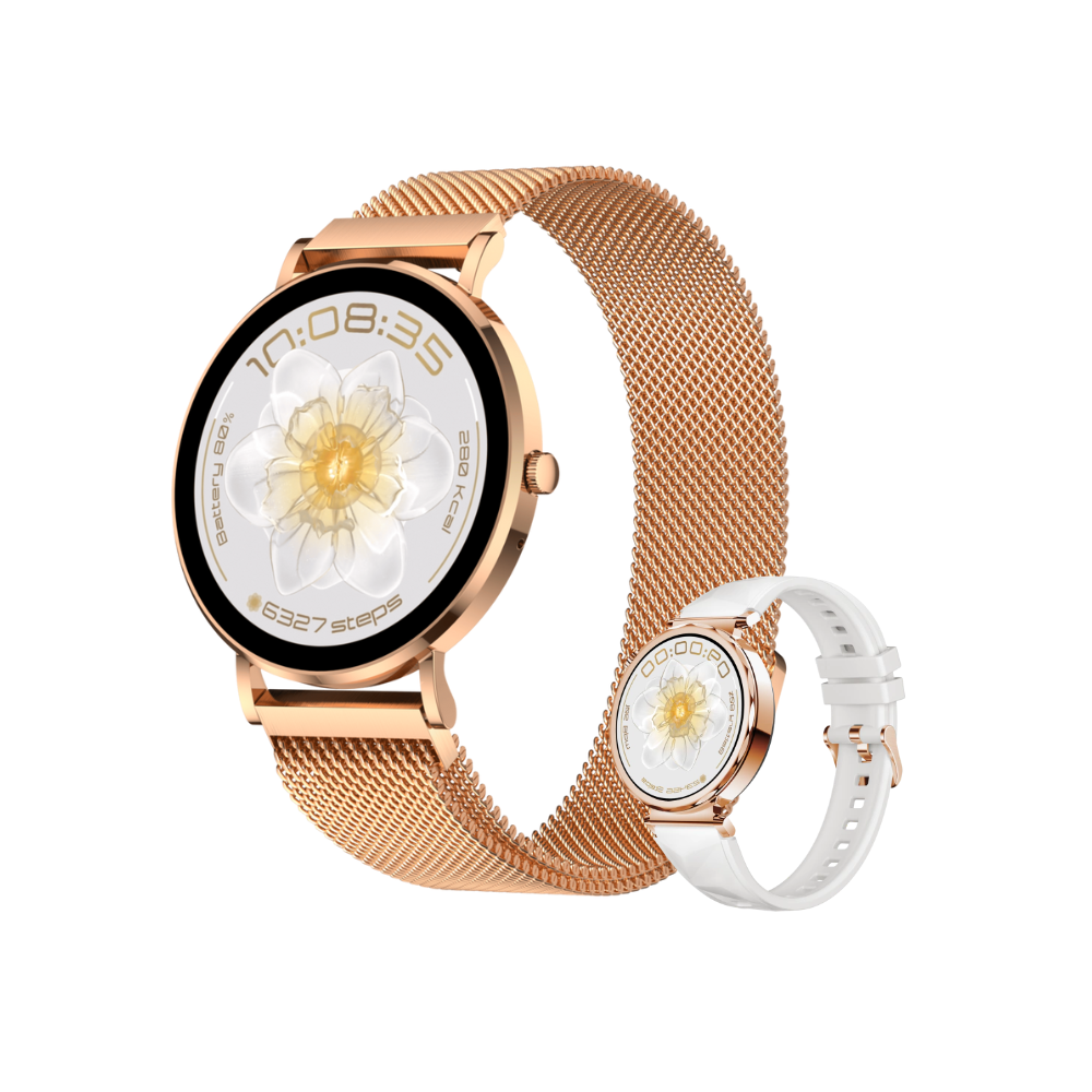 O Aurafit Ella 3 é um smartwatch pensado para o público feminino que busca unir estilo, tecnologia e bem-estar em um único dispositivo. Com design ultrafino, aro metálico dourado e pulseira de silicone delicada com detalhes florais, ele é perfeito para acompanhar seu dia a dia com sofisticação.